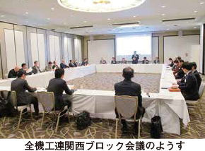 全日本機械工具商連合会(全機工連、坂井俊司会長)の関西ブロック会議(古里龍平ブロック長=当組合副理事長)が、2月26日に大阪で行われました。会場となったJR大阪駅に隣接するホテルグランヴィア大阪には、大阪機械器具卸商協同組合のメンバーの他、全機工連関西ブロックの福井県機工商組合、滋賀県機械工具商組合、はりまMS交流会、広島県機械工具商組合、高松機械工具商組合から代表者が参集するなど総勢40名が出席しました。今回の関西ブロック会議では、「働き方改革」や「組織・人事」、「人材育成」、「福利厚生」などに関し、各社が取り組む施策について9つの企業から発表があり、それをもとに議論を進めました。