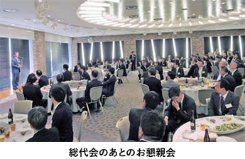 続く懇親会は、役員・総代以外の組合員、メーカー会員(メーカー)が加わり総勢約150名が出席しました。これは当組合の1年間の行事や取り組みを説明する事業報告も兼ねており、今年は牛田幸吉氏から報告が行われました。